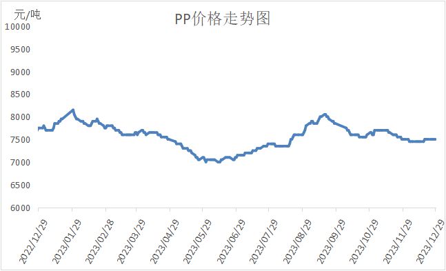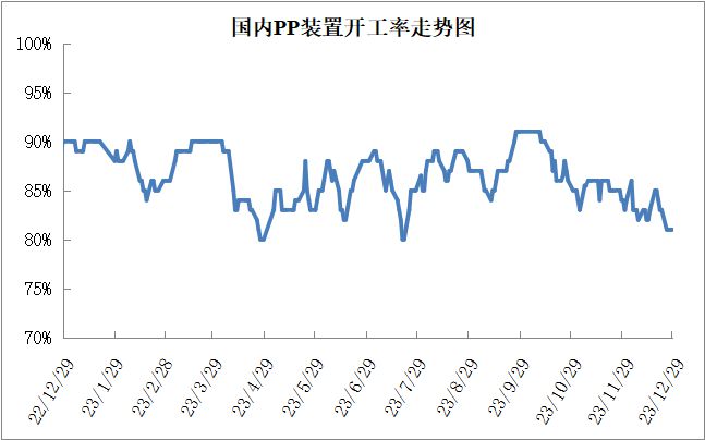油價(jià)震蕩整理,布倫特在80美元附近。前期油價(jià)在高庫(kù)存壓力下一度大跌,但是在前低附近獲得支撐,且紅海事件引發(fā)市場(chǎng)擔(dān)憂,油價(jià)止跌反彈,其中布倫特反彈至80美元附近受阻。雖然油價(jià)反彈受阻,但是整體較前期高點(diǎn)下跌較多,且人民幣貶值告一段落開(kāi)始升值,進(jìn)口成本有所下降,油制PP虧損也較前期明顯改善,目前虧損800元/噸附近。